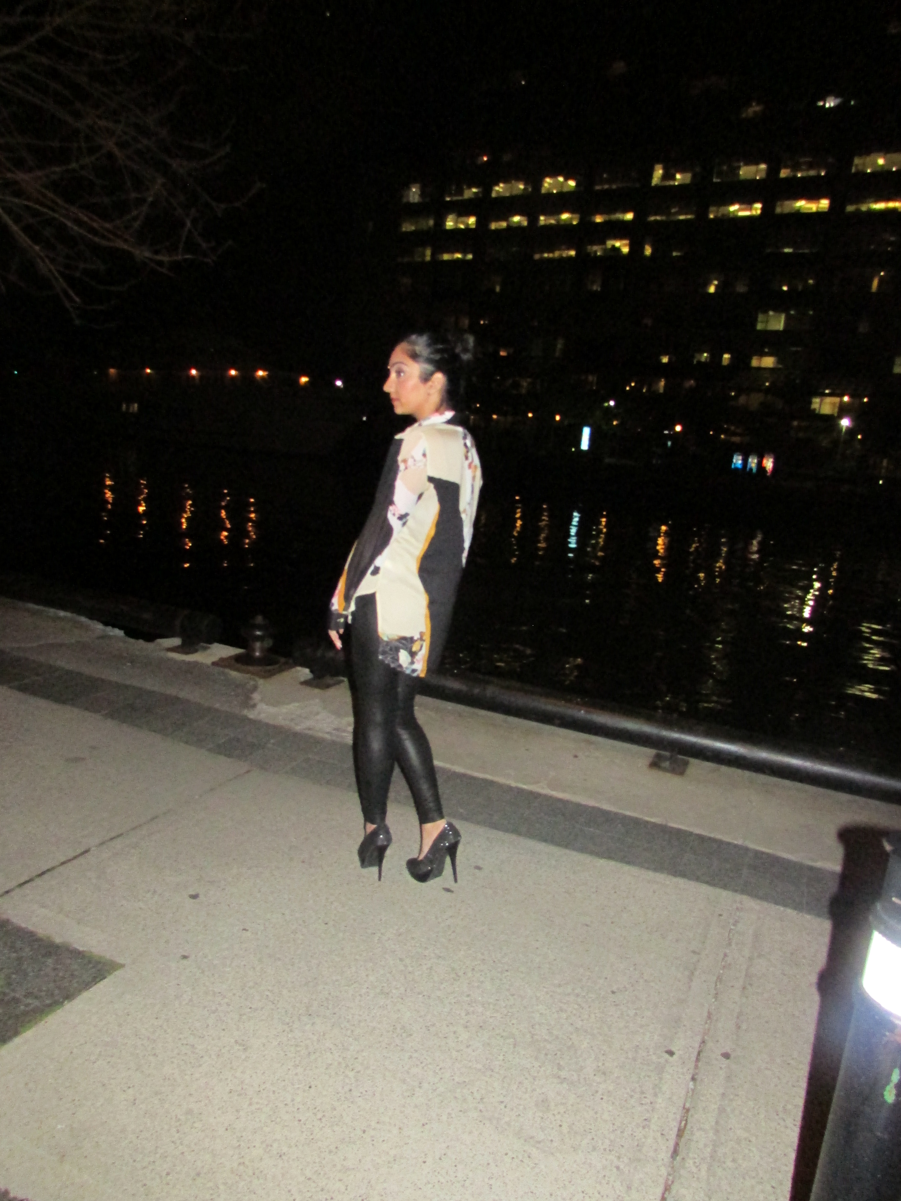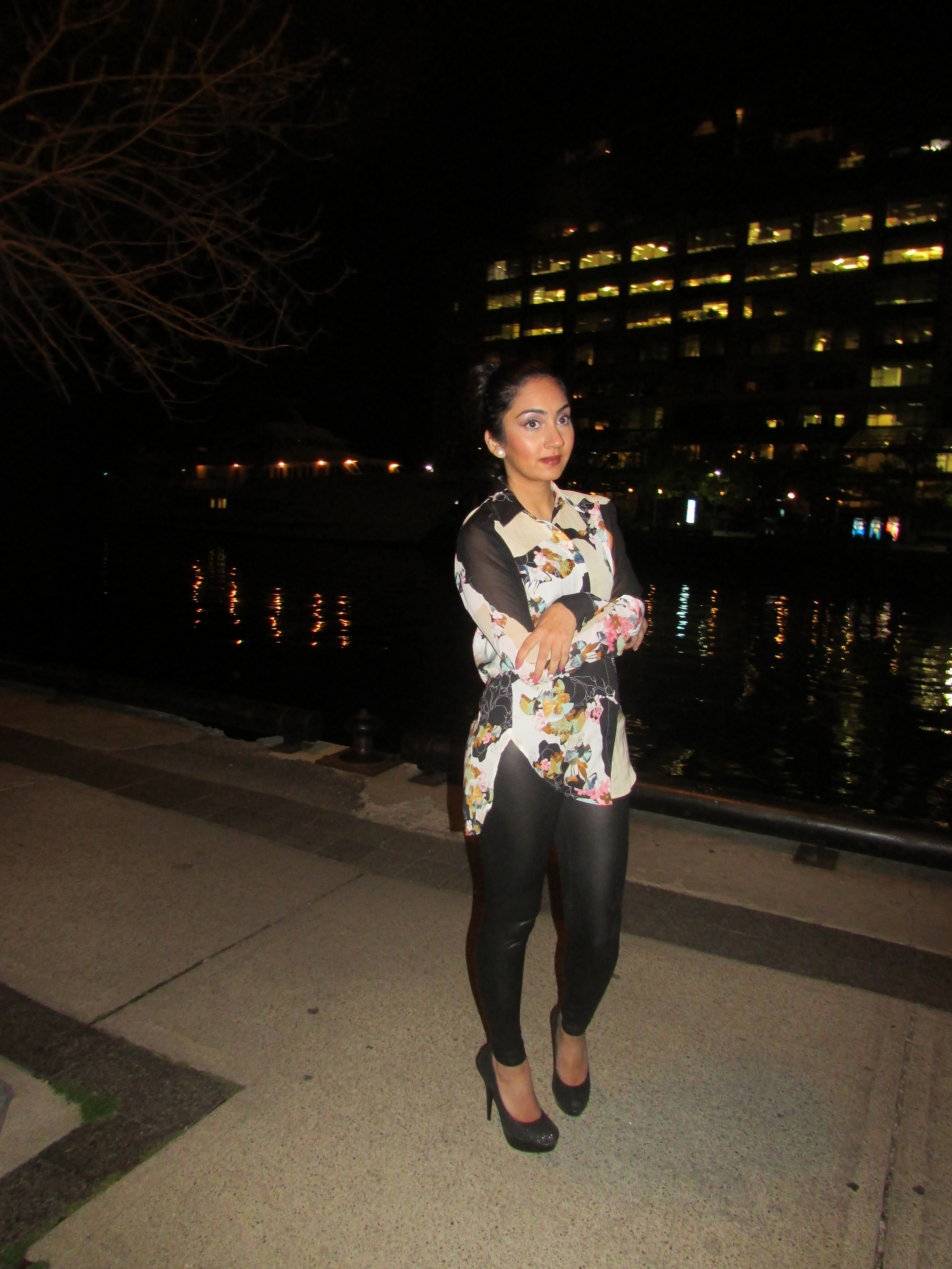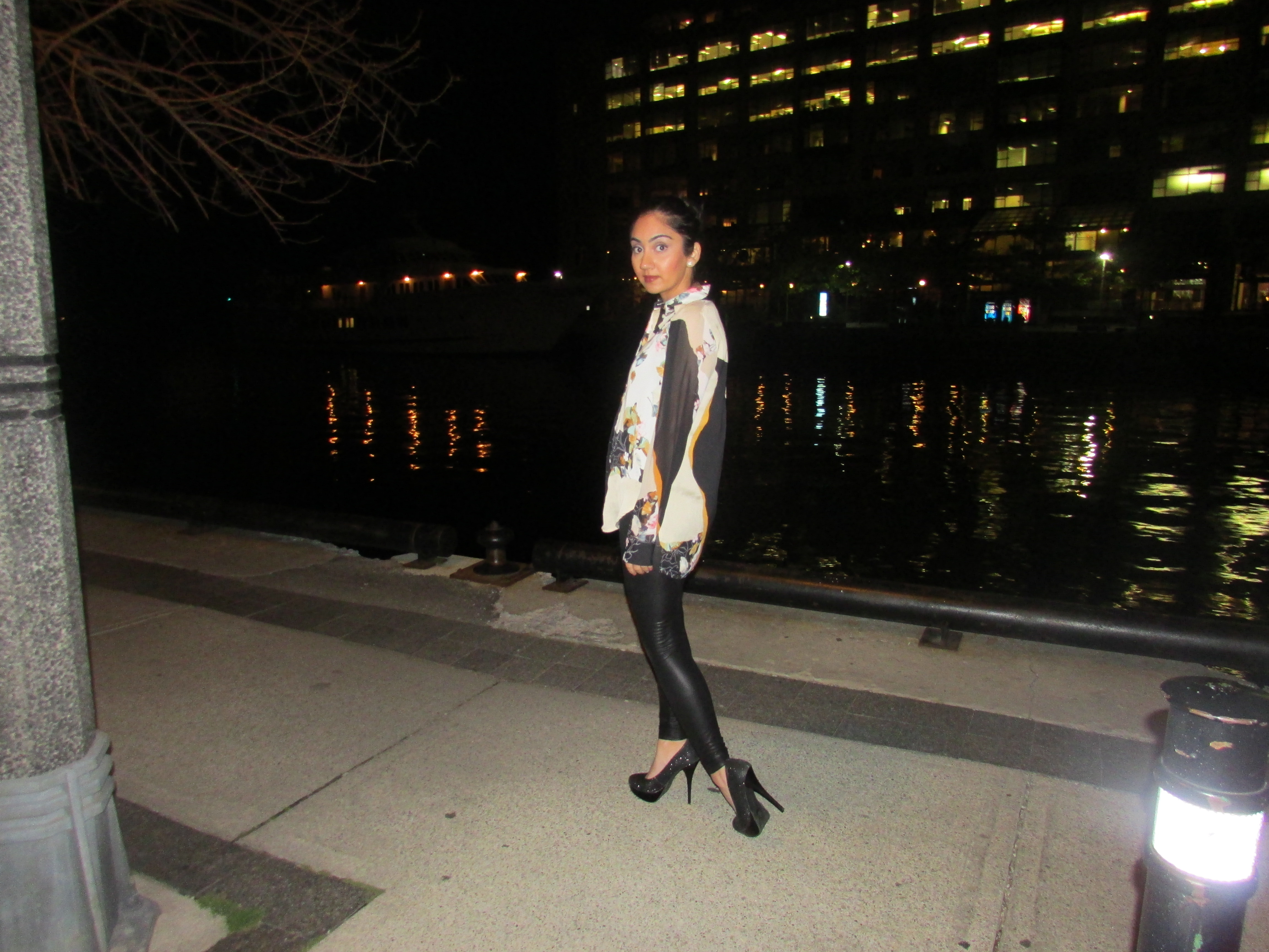 My outfit was a mixture of a conservative business event mixed with a more casual, party atmosphere.When it comes to business events (non fashion related) my rule of thumb is usually any type buttoned down shirt is appropriate. Keeping that in mind I brought out this amazing shirt that was apart of the Phillip Lim for Target collection (released September 2013). It was one of my favorite collaborations thus far, I have 5 other pieces from that collection and I love them all so much. I have worn this shirt tucked in with a dress pant however I like it much better let out and free so you can see all the beautiful details of the design. I paired it with faux leather leggings to dress it up some more and give it more of a fun, Friday night party type of feel. I had my hair tied in a sleek bun (truthfully because it was oily) but I am happy I did because I think it gave the outfit a bit more sophistication and kept the focus on the shirt and all its beautiful details.