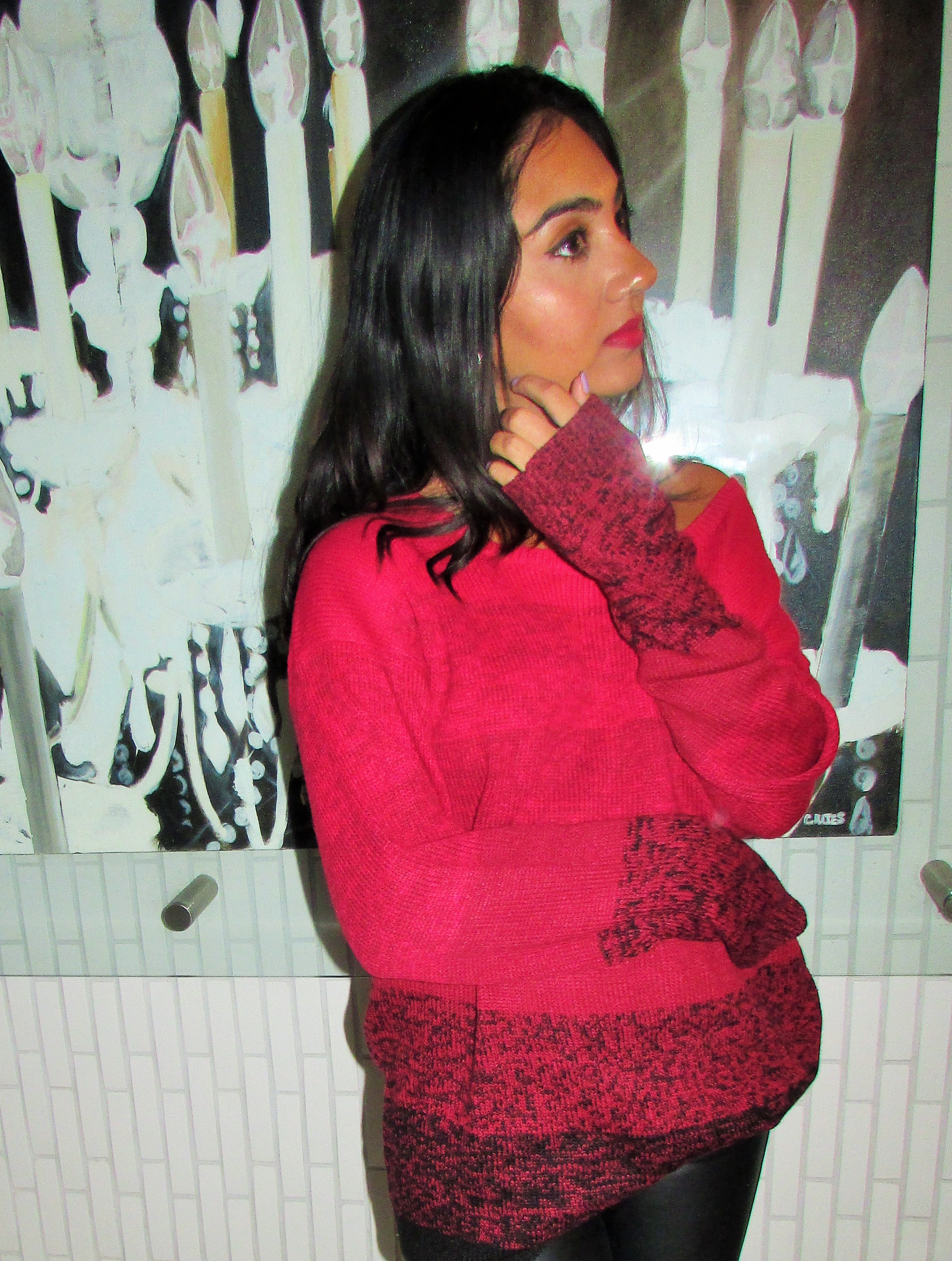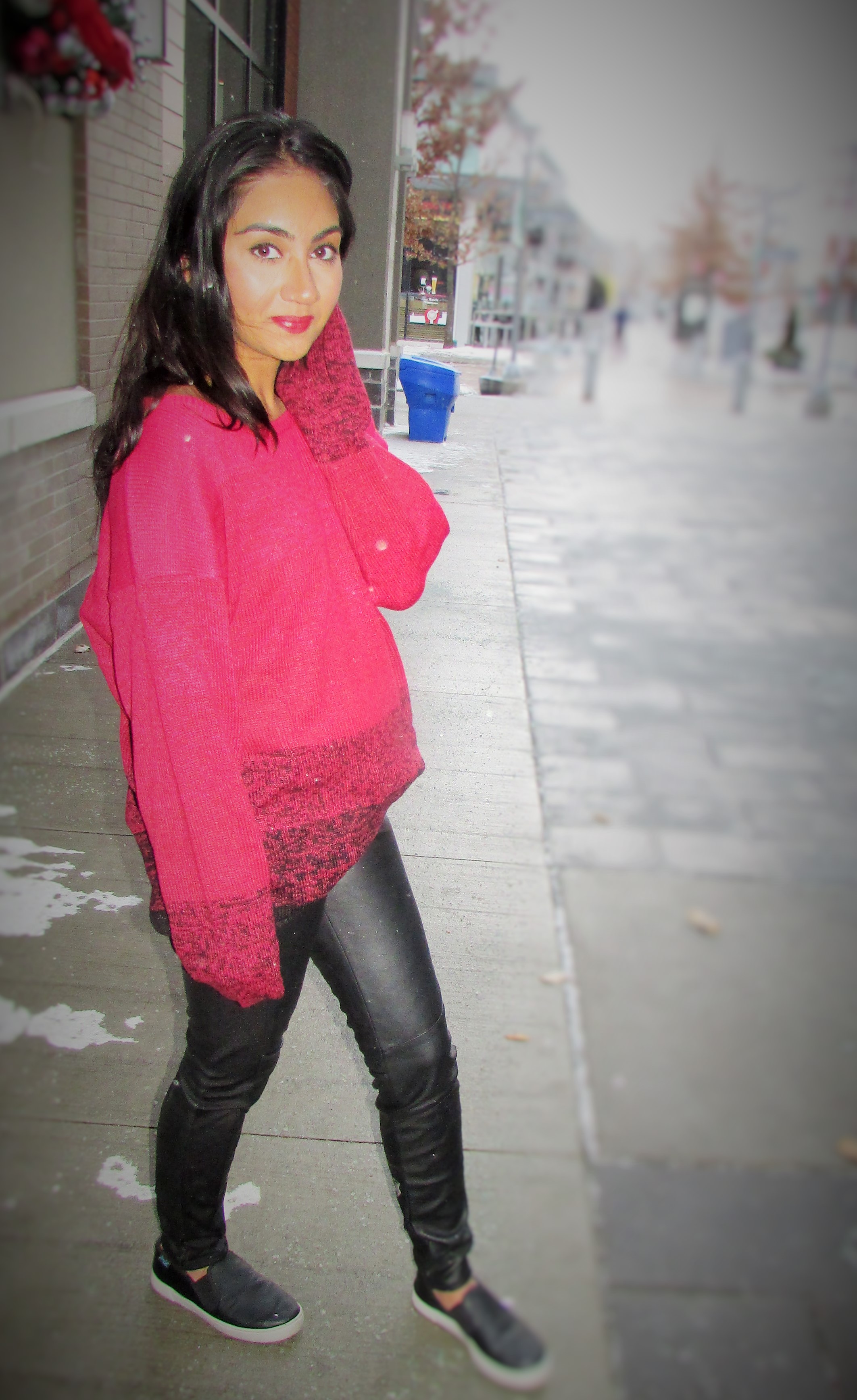 IMG_2788 (2)But really though, are you ready for Winter? Are we ever? I love vacationing somewhere warm during the winter months to escape for a little however this year as I left for Jamaica it was beautiful sunny positive weather in Toronto with no snow but then of course once I came back the negative weather kicked it, it starts to snow, ridiculous winds and extreme cold weather. Yay. My (hard) work into getting a great tan will now be hidden under the bundles of layers I must wear. Even though it is winter and freezing every year we all still try to dress up, look presentable and try to stay warm but let’s be honest, there are just those days when all you want to do is put on your biggest, warmest, coziest sweater and call it a day. On that note, I introduce to you my outfit. An over-sized sweater, faux leather pants and slip on sneakers. It’s almost as casual as it gets but I think the bright color in the sweater, matching red lips, faux leather, fringe purse and a few accessories pull the look together so you don’t look like you are dressed in a Snuggie.