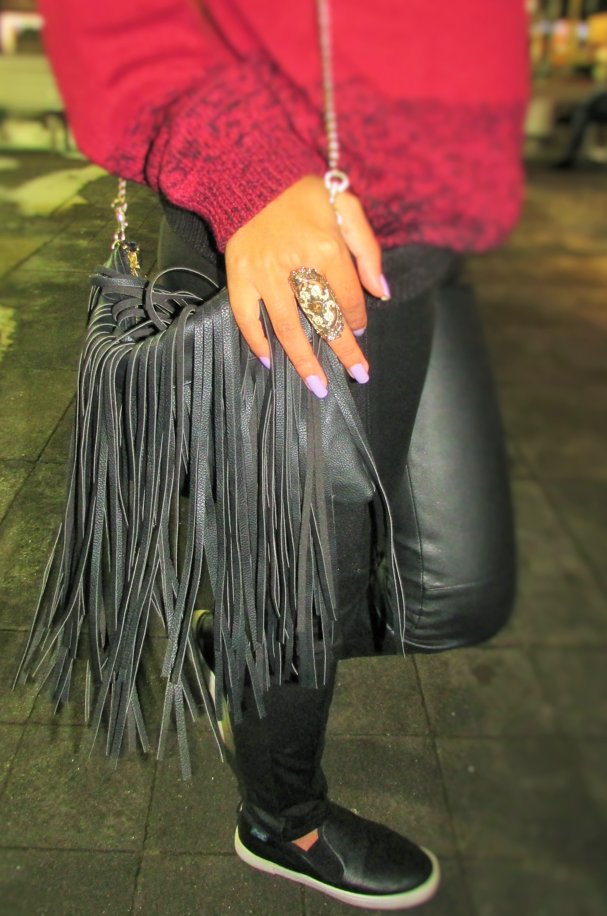 IMG_2795 (2)Sweater: H&M | Faux Leather Pants: H&M | Sneakers: Blowfish Malibu | Fringe Purse: H&M | Ring: Forever 21 | Nails:Lavender Sky by Avon |Lipstick: Pin Up – LA Girl Lip Paint