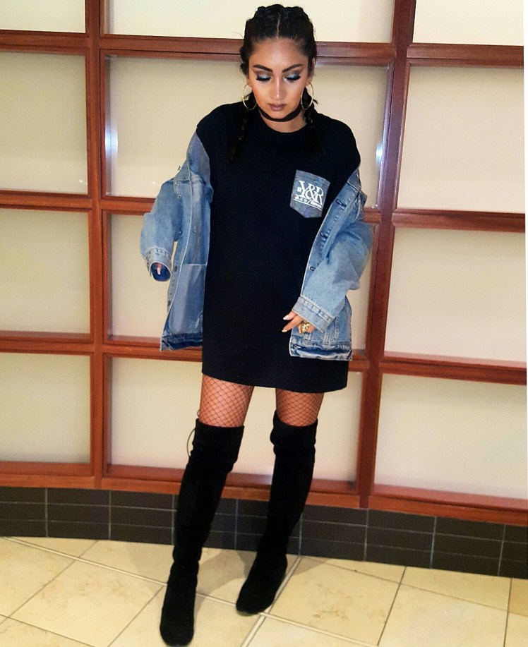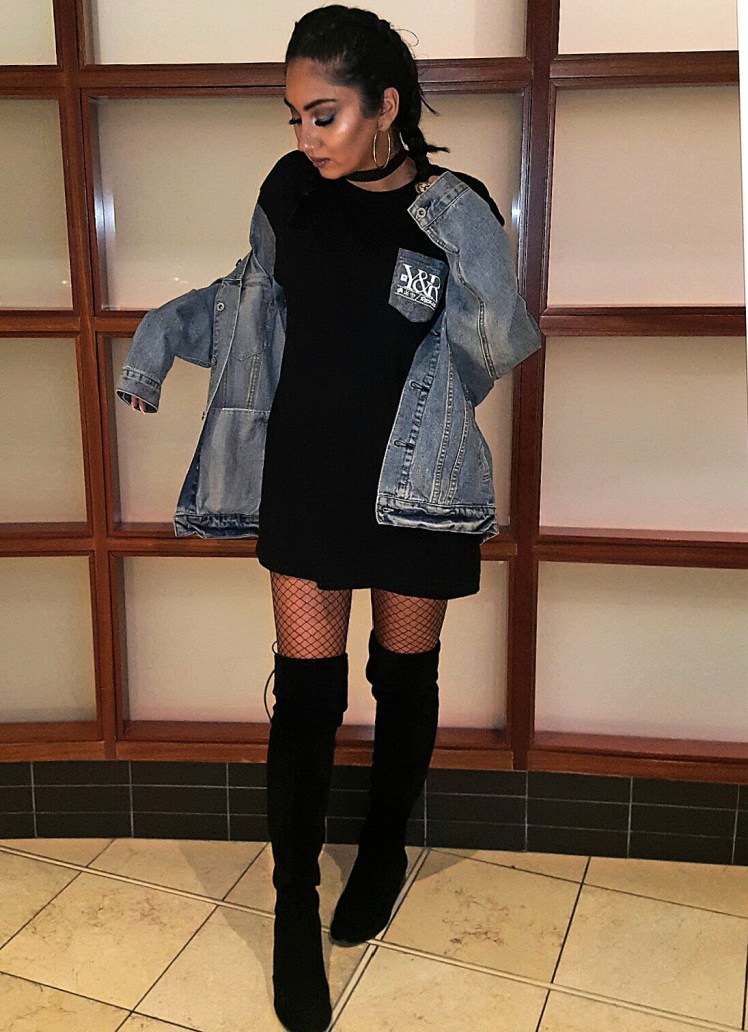 On Day 2 I brought out my (not so) inner fabulous ratchet side. I literally threw on an old tee from my brothers closet (Young and Reckless) with some thigh high boots and fishnets because that’s all the trend right now. Minimal basic accessories of gold hoops and a choker. My glam consisted of Dutch braids, easy on the eyes (compared to day one) which was a sharp blue winged liner and a darker, yet neutral matte lip.