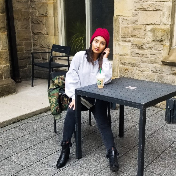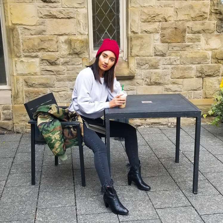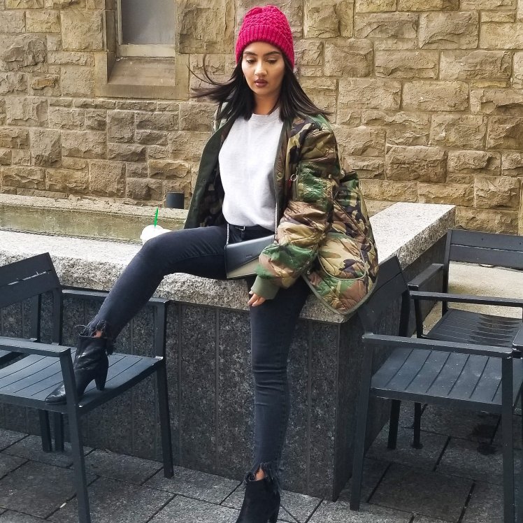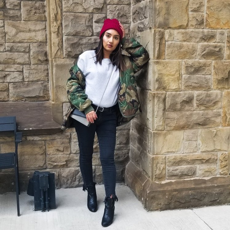 To finish off the look I added a new purse/crossbody I got from Danier Leather that has just enough space for keys, mini wallet and a lipstick. I also have been loving this oversized camo jacket from Alpha Industries – its an XL which in hindsight is a bit too big but I love the oversized look and it just adds a little extra, fashion forward look to your basic outfit. Lastly, I have been wearing this red Lole hat everyday for the past week because it adds colour to your outfit, keeps your ears nice and warm and hides your under styled, possibly greasy hair.